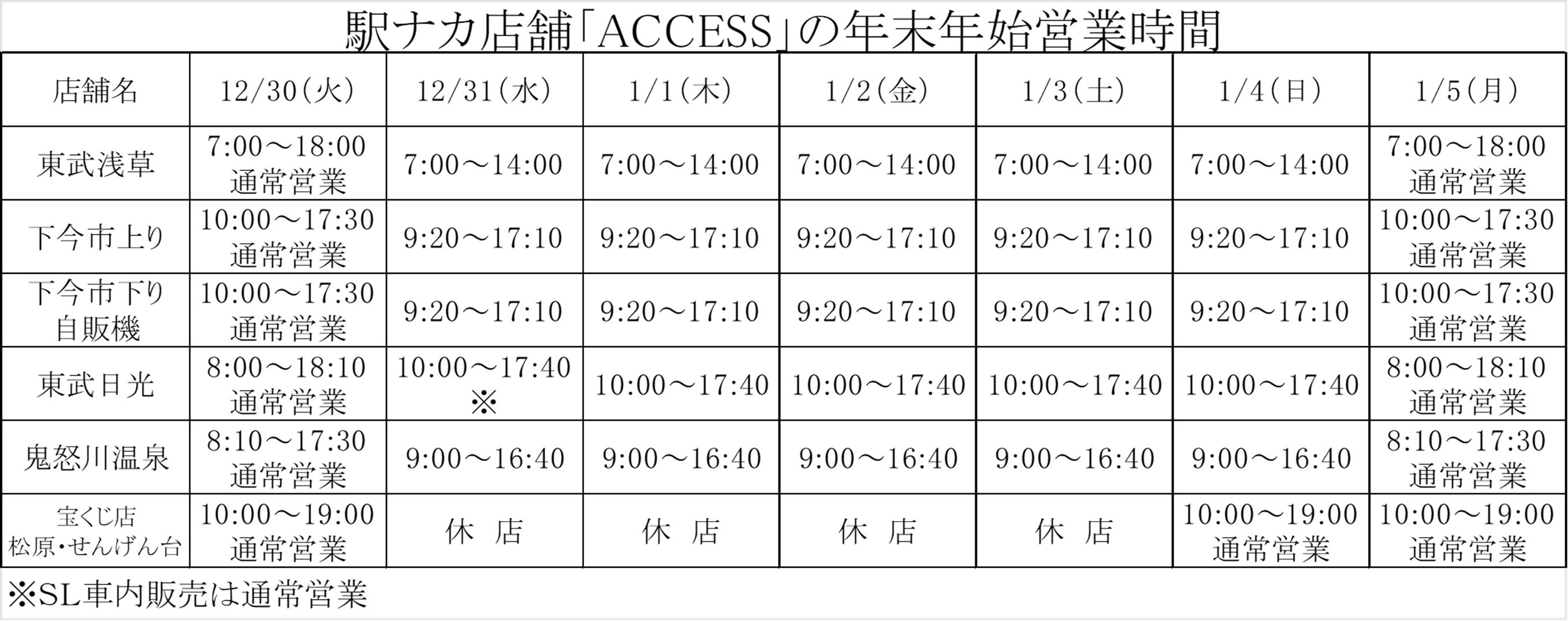 ACCESS各駅店舗の年末年始の営業時間は下記の通りとなります。