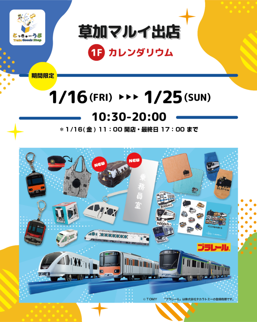 また、2026年1月16日(金)~1月25日(日)の期間、草加マルイ1Fカレンダリウムにて、東武鉄道グッズを販売いたします。本イベントでも新商品を発売いたしますので、皆様のお越しをお待ちしております。ぜひお気軽にお立ち寄りくださいませ。