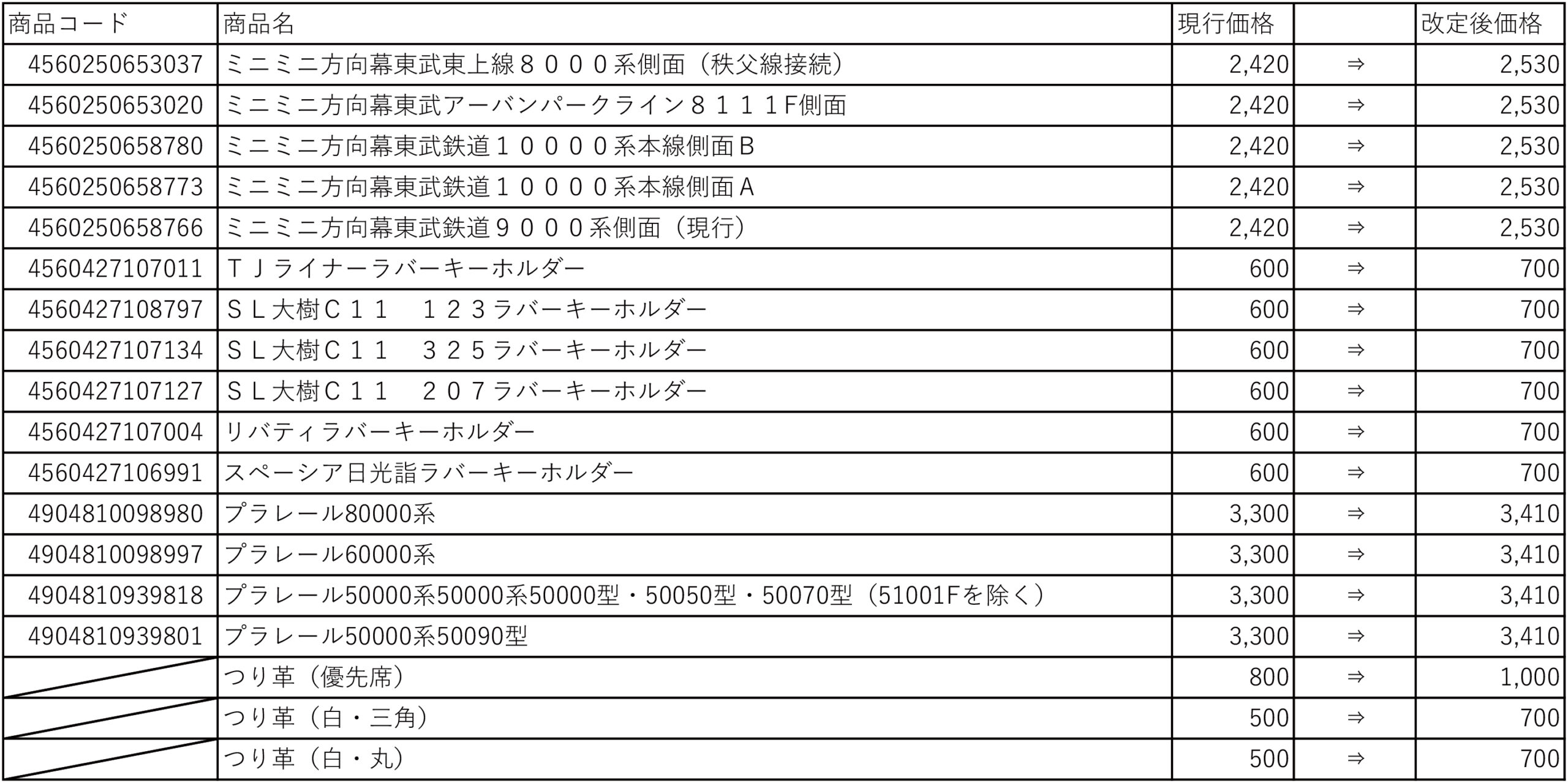 価格改定対象商品一覧(値上げ)