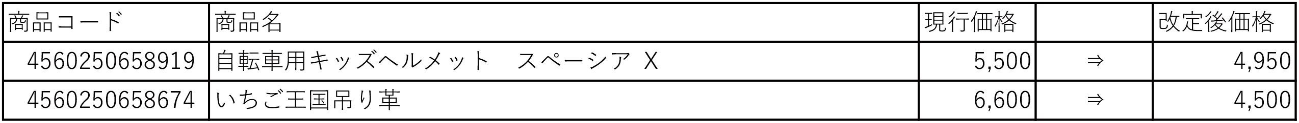 価格改定対象商品一覧(値下げ)